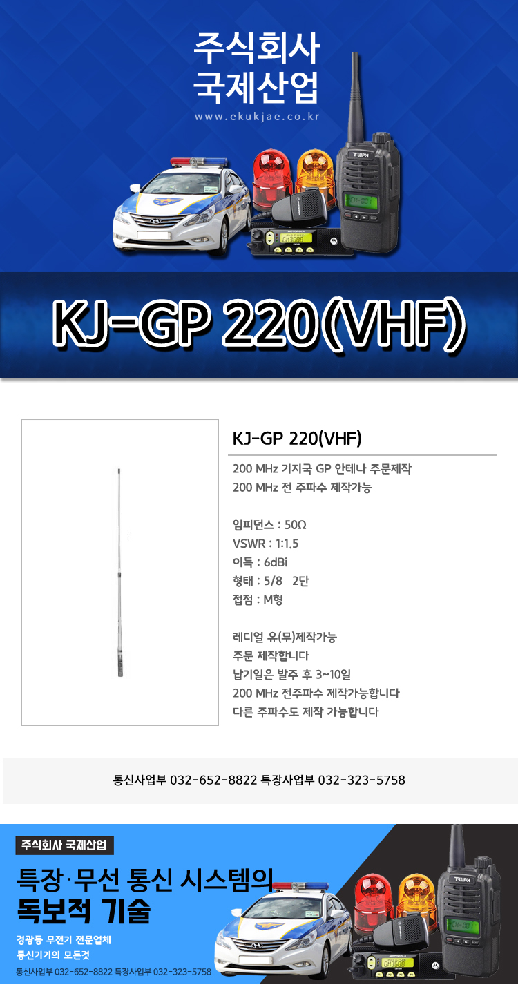 KJ-GP 220 기지국 GP 안테나 서울,구리,남양주,하남,고양,의정부,양주,포천,동두천,김포,광명,인천,시흥,안산,의왕,성남,광주,수원,화성,용인,오산,평택,양평,이천,여주,원주,횡성,홍천,가평,춘천,화천,양구,인제,강원도,경기도,강릉,양양,평창,정선,영월,제천,고성,속초,강릉,동해,삼척,태백,단양,봉화,울진,영양,영주,예천,천안,진천,음성,충주,괴산,청주,아산,당진,태안,서산,보령,공주,세종,대전,계롱,논산,금삭,영동,서천,상주,문경,구미,김천,의성,안동,영광,고창,나주,목포,해남,여수,순천,통영,진주,창원,김해,부산,울산,경주,포항,대구,달성,LED,경광등,싸인보드,앰프스피커,특장,고소작업대,써치라이트,무전기,무선중계기,비상등,국제산업,주식회사국제산업,전광판,싸이렌앰프,안테나,멀티충전기,무전기충전기,무전기악세사리,무전기마이크,미니경광등,특수경광등,경찰경광등,경찰싸인보드,소방,국방,병원,경호,산악,등산,행사,쏠라경광등,태양열경광등.도로경광등.작업등,탐조등,유리부착경광등.리프트경광등,모토로라무전기