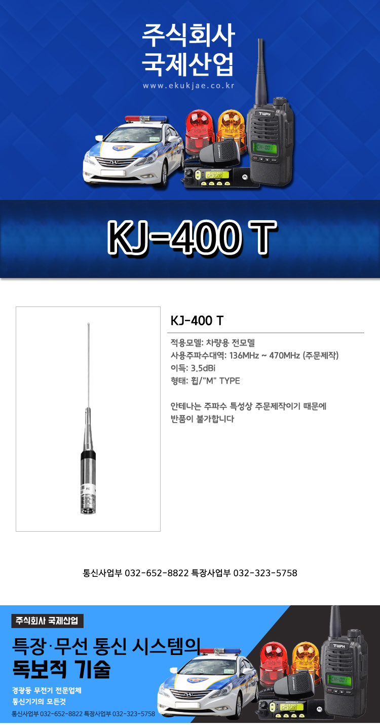 KJ-400 T 차량 안테나 서울,구리,남양주,하남,고양,의정부,양주,포천,동두천,김포,광명,인천,시흥,안산,의왕,성남,광주,수원,화성,용인,오산,평택,양평,이천,여주,원주,횡성,홍천,가평,춘천,화천,양구,인제,강원도,경기도,강릉,양양,평창,정선,영월,제천,고성,속초,강릉,동해,삼척,태백,단양,봉화,울진,영양,영주,예천,천안,진천,음성,충주,괴산,청주,아산,당진,태안,서산,보령,공주,세종,대전,계롱,논산,금삭,영동,서천,상주,문경,구미,김천,의성,안동,영광,고창,나주,목포,해남,여수,순천,통영,진주,창원,김해,부산,울산,경주,포항,대구,달성,LED,경광등,싸인보드,앰프스피커,특장,고소작업대,써치라이트,무전기,무선중계기,비상등,국제산업,주식회사국제산업,전광판,싸이렌앰프,안테나,멀티충전기,무전기충전기,무전기악세사리,무전기마이크,미니경광등,특수경광등,경찰경광등,경찰싸인보드,소방,국방,병원,경호,산악,등산,행사,쏠라경광등,태양열경광등.도로경광등.작업등,탐조등,유리부착경광등.리프트경광등,모토로라무전기