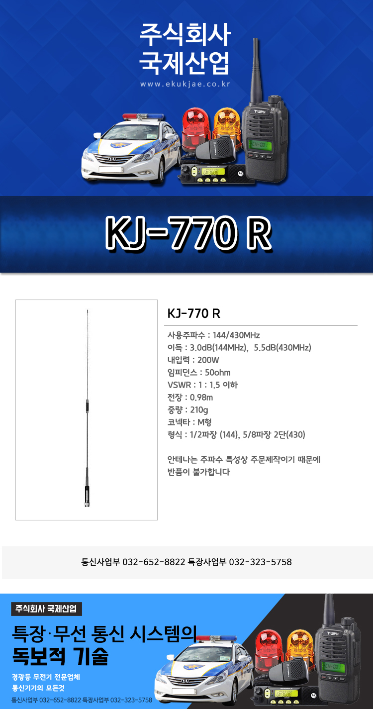 KJ-770 R 차량 안테나 서울,구리,남양주,하남,고양,의정부,양주,포천,동두천,김포,광명,인천,시흥,안산,의왕,성남,광주,수원,화성,용인,오산,평택,양평,이천,여주,원주,횡성,홍천,가평,춘천,화천,양구,인제,강원도,경기도,강릉,양양,평창,정선,영월,제천,고성,속초,강릉,동해,삼척,태백,단양,봉화,울진,영양,영주,예천,천안,진천,음성,충주,괴산,청주,아산,당진,태안,서산,보령,공주,세종,대전,계롱,논산,금삭,영동,서천,상주,문경,구미,김천,의성,안동,영광,고창,나주,목포,해남,여수,순천,통영,진주,창원,김해,부산,울산,경주,포항,대구,달성,LED,경광등,싸인보드,앰프스피커,특장,고소작업대,써치라이트,무전기,무선중계기,비상등,국제산업,주식회사국제산업,전광판,싸이렌앰프,안테나,멀티충전기,무전기충전기,무전기악세사리,무전기마이크,미니경광등,특수경광등,경찰경광등,경찰싸인보드,소방,국방,병원,경호,산악,등산,행사,쏠라경광등,태양열경광등.도로경광등.작업등,탐조등,유리부착경광등.리프트경광등,모토로라무전기