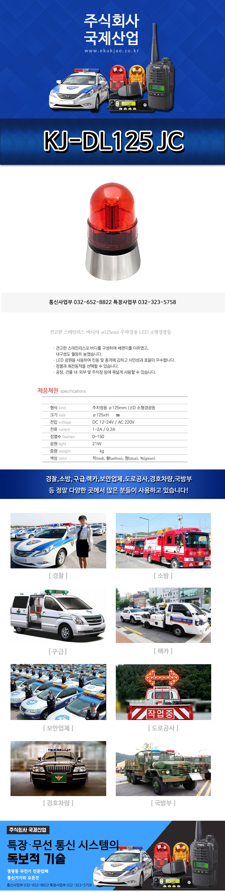KJ-DL-125 JC 서울,구리,남양주,하남,고양,의정부,양주,포천,동두천,김포,광명,인천,시흥,안산,의왕,성남,광주,수원,화성,용인,오산,평택,양평,이천,여주,원주,횡성,홍천,가평,춘천,화천,양구,인제,강원도,경기도,강릉,양양,평창,정선,영월,제천,고성,속초,강릉,동해,삼척,태백,단양,봉화,울진,영양,영주,예천,천안,진천,음성,충주,괴산,청주,아산,당진,태안,서산,보령,공주,세종,대전,계롱,논산,금삭,영동,서천,상주,문경,구미,김천,의성,안동,영광,고창,나주,목포,해남,여수,순천,통영,진주,창원,김해,부산,울산,경주,포항,대구,달성,LED,경광등,싸인보드,앰프스피커,특장,고소작업대,써치라이트,무전기,무선중계기,비상등,국제산업,주식회사국제산업,전광판,싸이렌앰프,안테나,멀티충전기,무전기충전기,무전기악세사리,무전기마이크,미니경광등,특수경광등,경찰경광등,경찰싸인보드,소방,국방,병원,경호,산악,등산,행사,쏠라경광등,태양열경광등.도로경광등.작업등,탐조등,유리부착경광등.리프트경광등,모토로라무전기